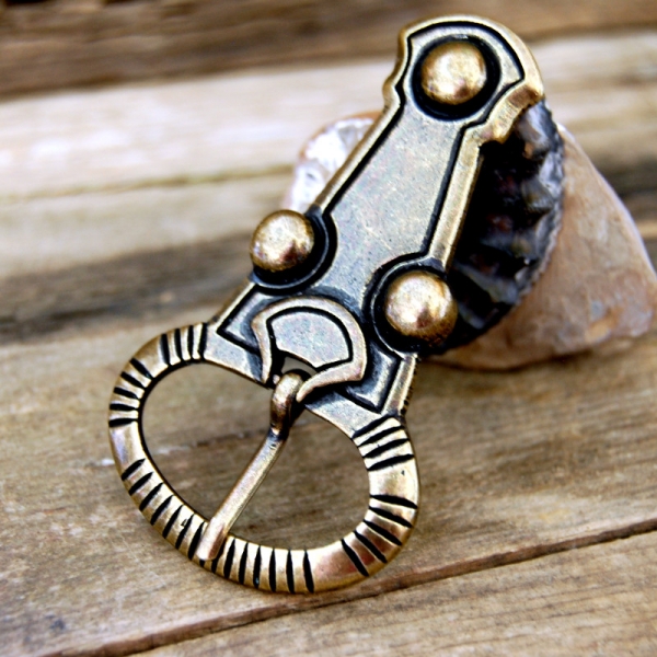 Replik einer Gürtelschnalle der Germanen des 5.-6. Jahrhunderts. Gefertigt ist die Schnalle aus massivem Zamakguss und geeignet für alle Gürtel mit einer Breite von 4 cm. Sie hat auf der Rückseite 3 Nietstifte und kann mit den beiliegenden Nietkappen recht einfach auf einem Stück Leder aufgenietet werden.