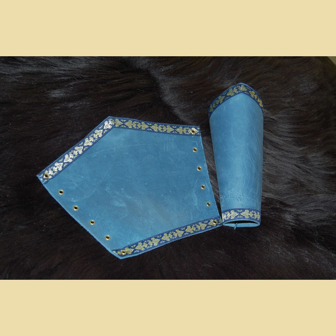Edle Armstulpen aus Fettleder, die von uns mit einer farblich darauf abgestimmten Borte verziert werden. Die Armschienen werden mit einer Schnürung geschlossen und lassen sich daher ideal anpassen. Das Design macht sie ideal für einen Adligen, reichen Kaufmann oder Edelmann auf Reisen im Larp.