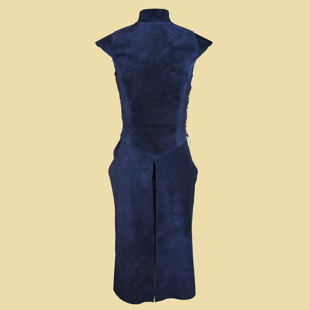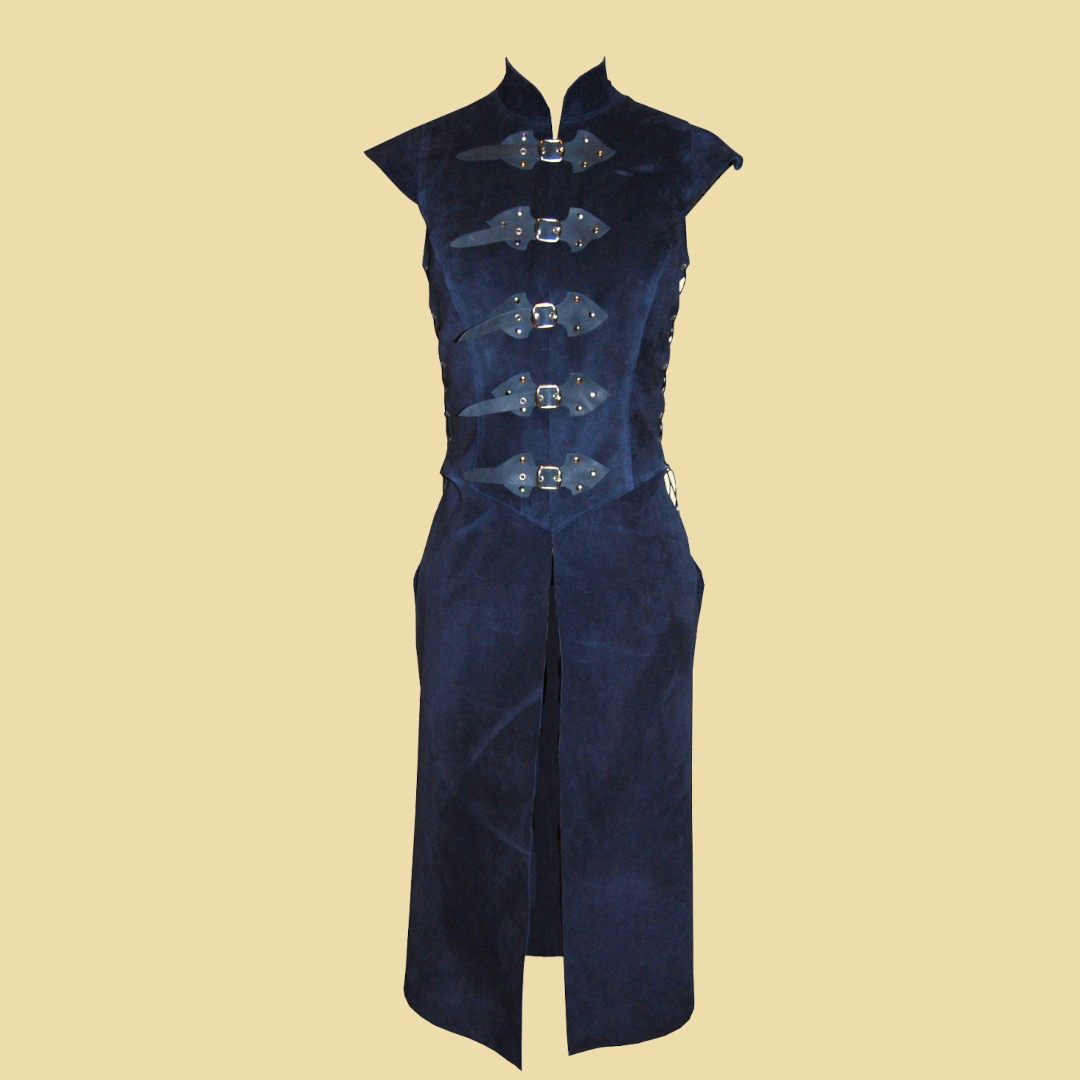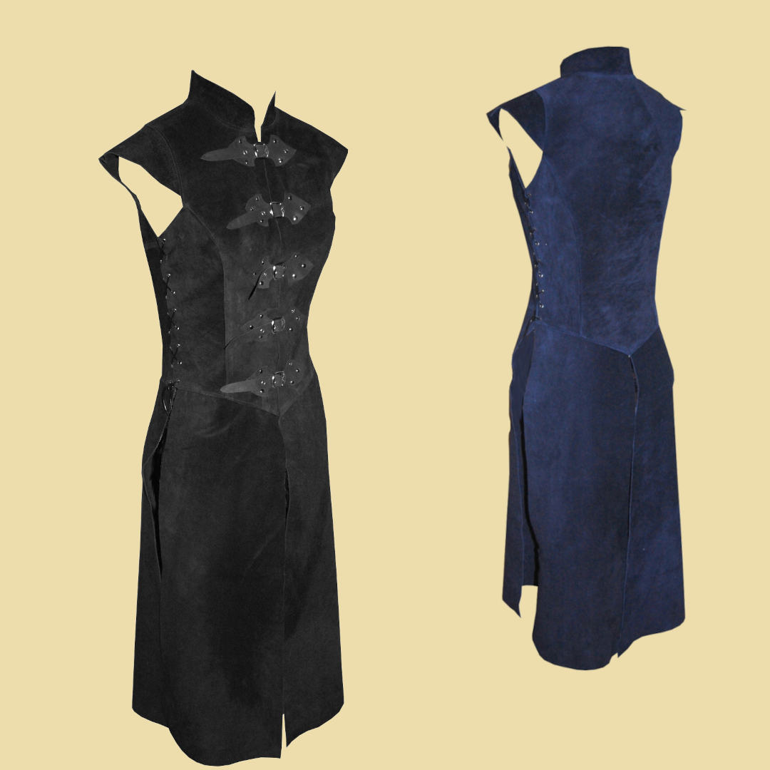 Weicher Damenwaffenrock aus Velourleder. Er wird mit einem Schnallenverschluss auf der Vorderseite verschlossen und an den Seiten mit Lederbändern geschnürt, so dass er in der Weite variabel ist und einen hohen Tragekomfort bietet. Durch die Schnürung lässt sich der Waffenrock individuell anpassen und kann sowohl figurbetont als auch etwas weiter getragen werden. Dieser Lederwaffenrock passt ausgezeichnet auf einen Mittelaltermarkt und zu einer ganzen Bandbreite an Archetypen im Larp. Seien es Söldnerinnen, Kriegerinnen, oder Waldläuferinnen.