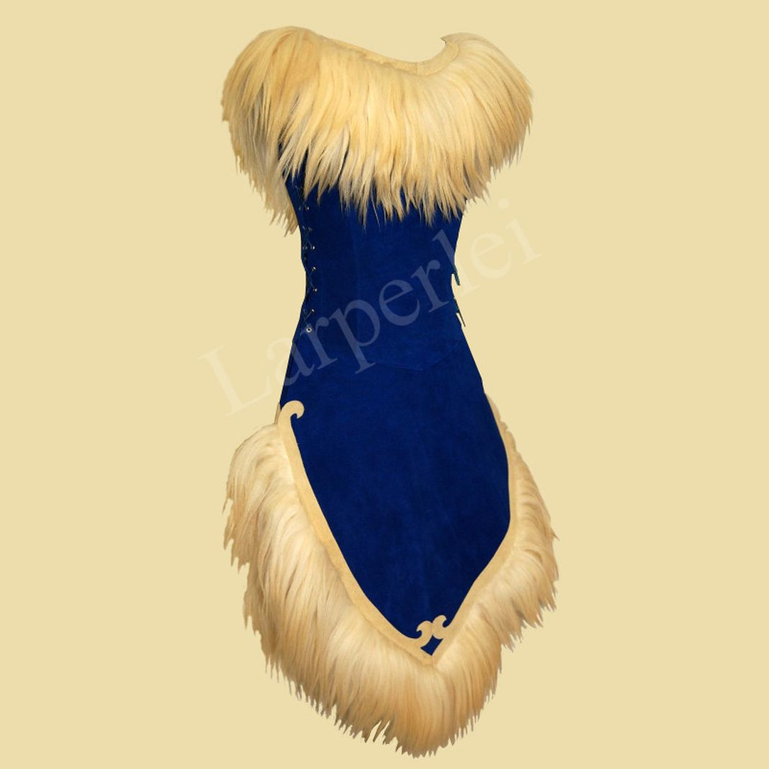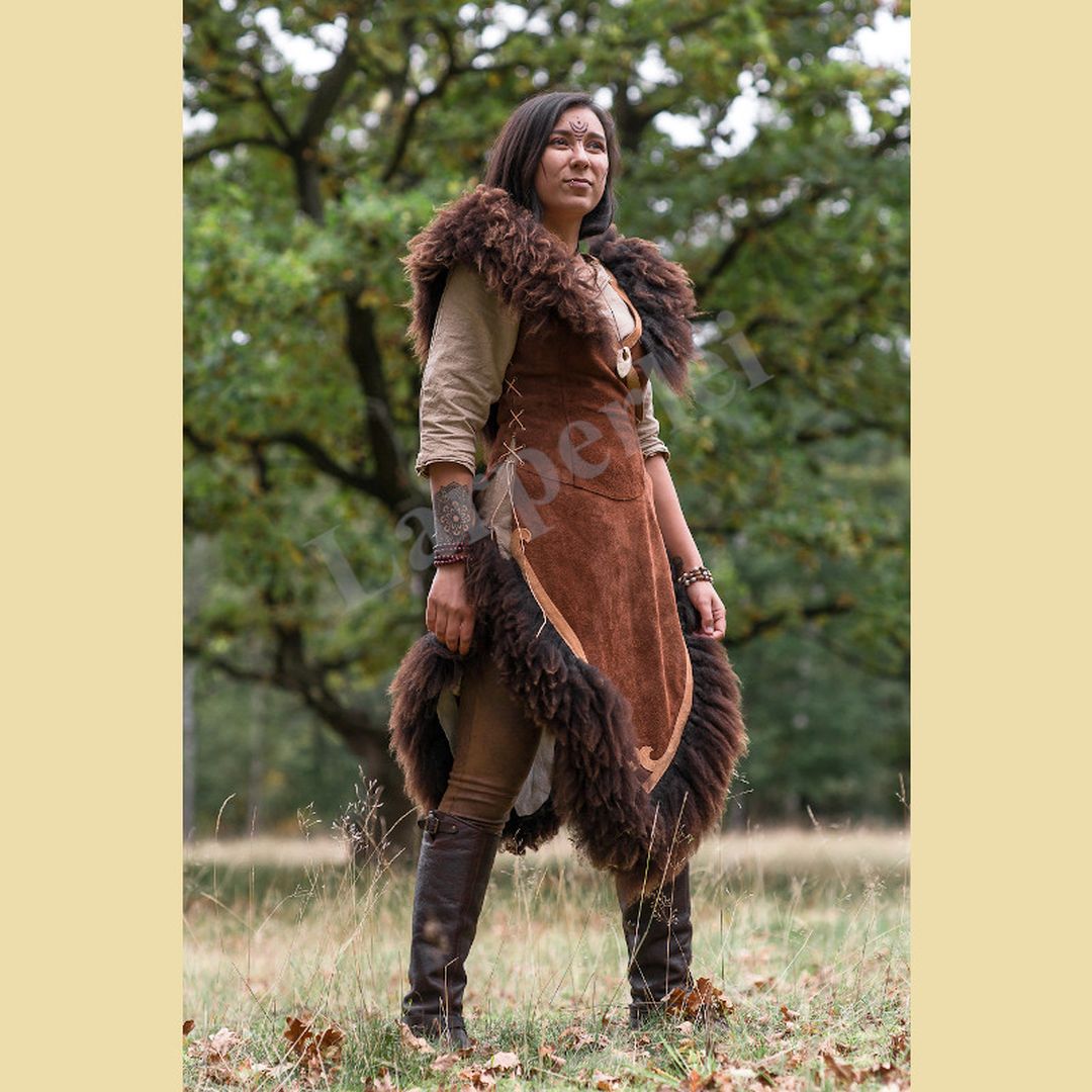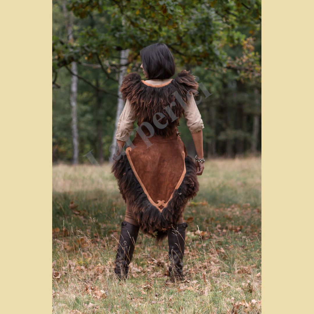 Weicher, asymmetrisch geschnittener Waffenrock aus Velourleder für die Dame, besetzt mit dekorativen Lederapplikationen und üppigem Schaffell. Er wird mittels 2 Schnallen seitlich verschlossen und mit Lederbändern geschnürt, so dass er in der Weite variabel ist und einen hohen Tragekomfort bietet. Durch die Schnürung lässt sich der Waffenrock individuell anpassen und kann sowohl figurbetont als auch etwas weiter getragen werden.