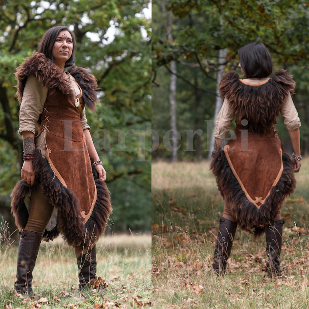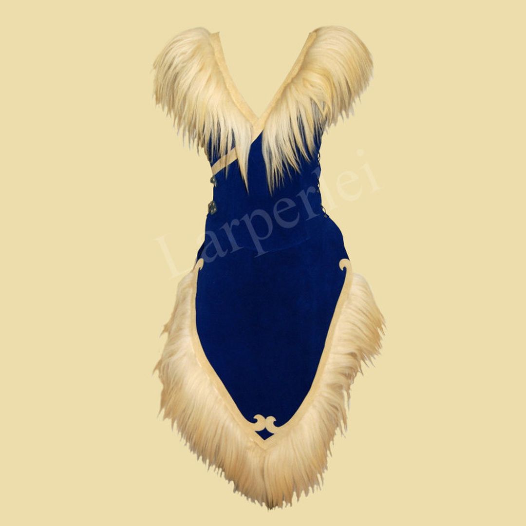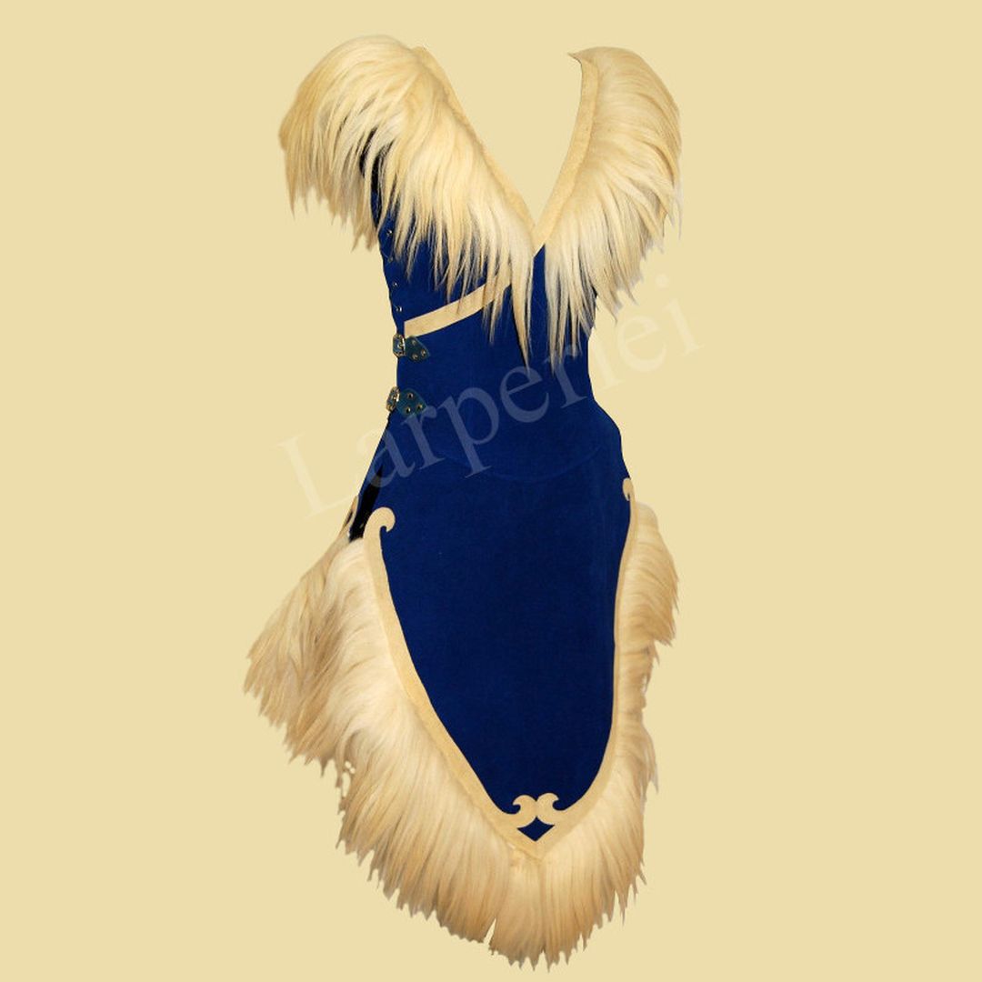 Weicher, asymmetrisch geschnittener Waffenrock aus Velourleder für die Dame, besetzt mit dekorativen Lederapplikationen und üppigem Schaffell. Er wird mittels 2 Schnallen seitlich verschlossen und mit Lederbändern geschnürt, so dass er in der Weite variabel ist und einen hohen Tragekomfort bietet. Durch die Schnürung lässt sich der Waffenrock individuell anpassen und kann sowohl figurbetont als auch etwas weiter getragen werden.