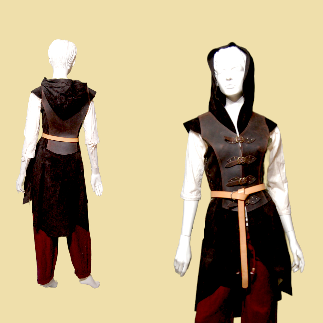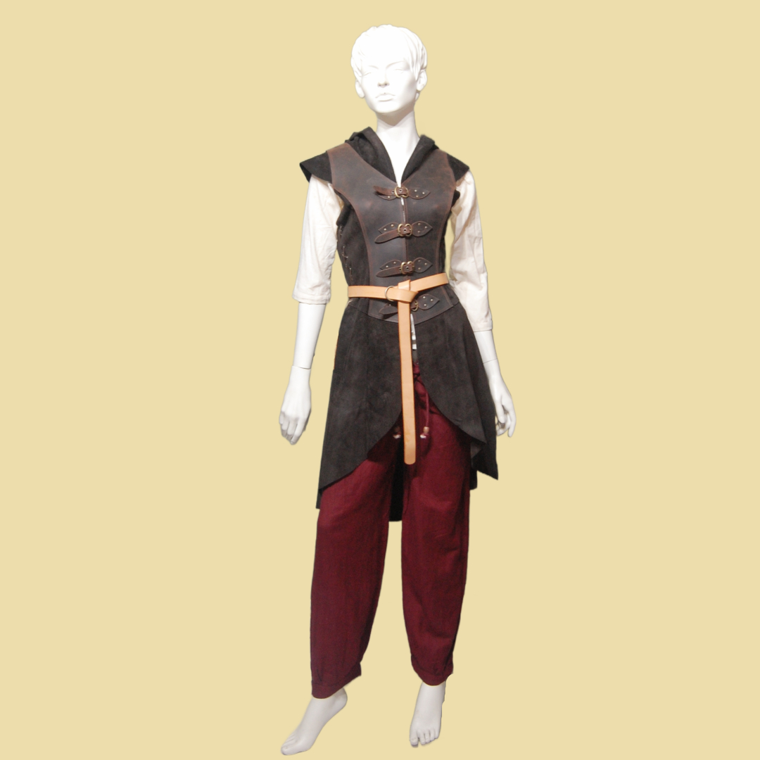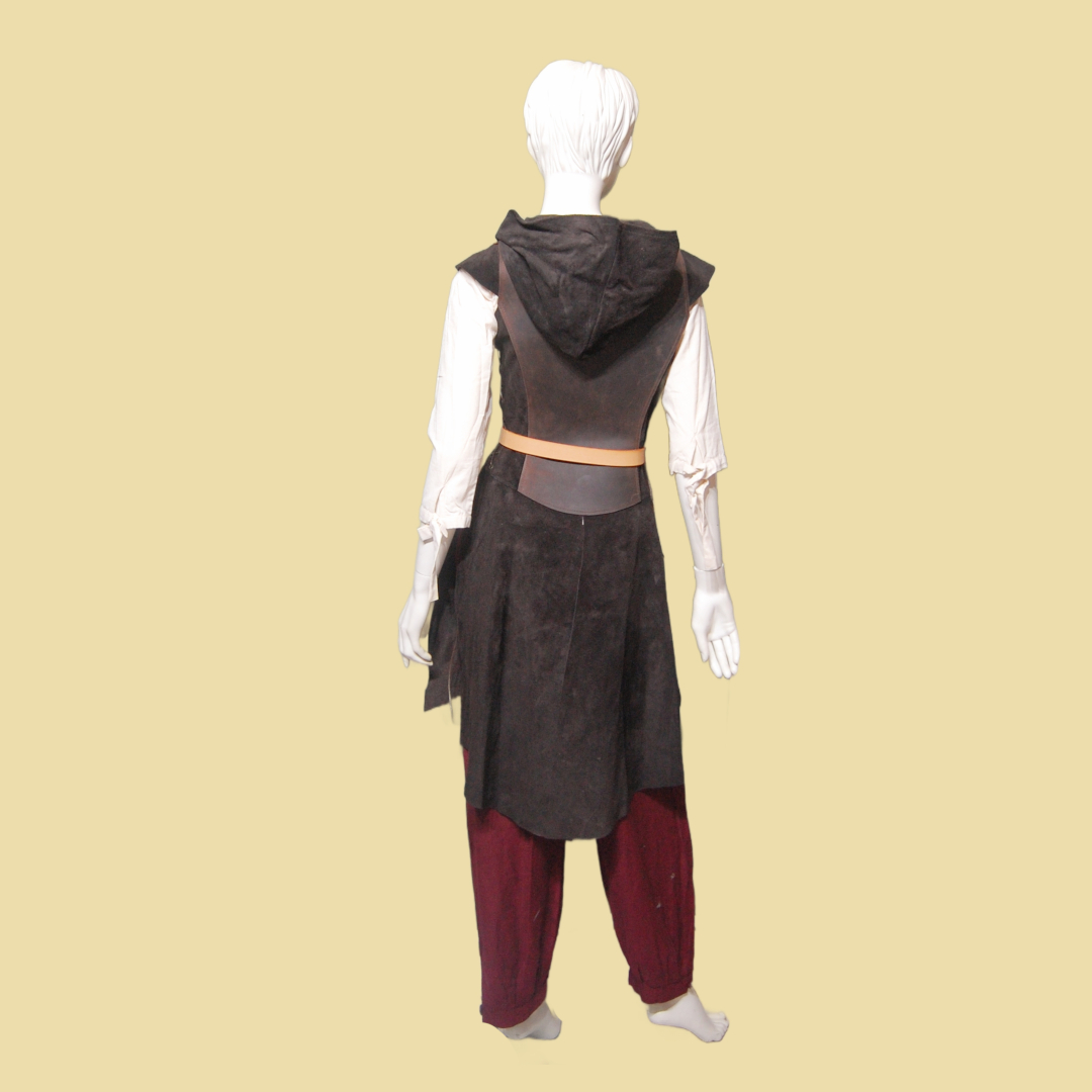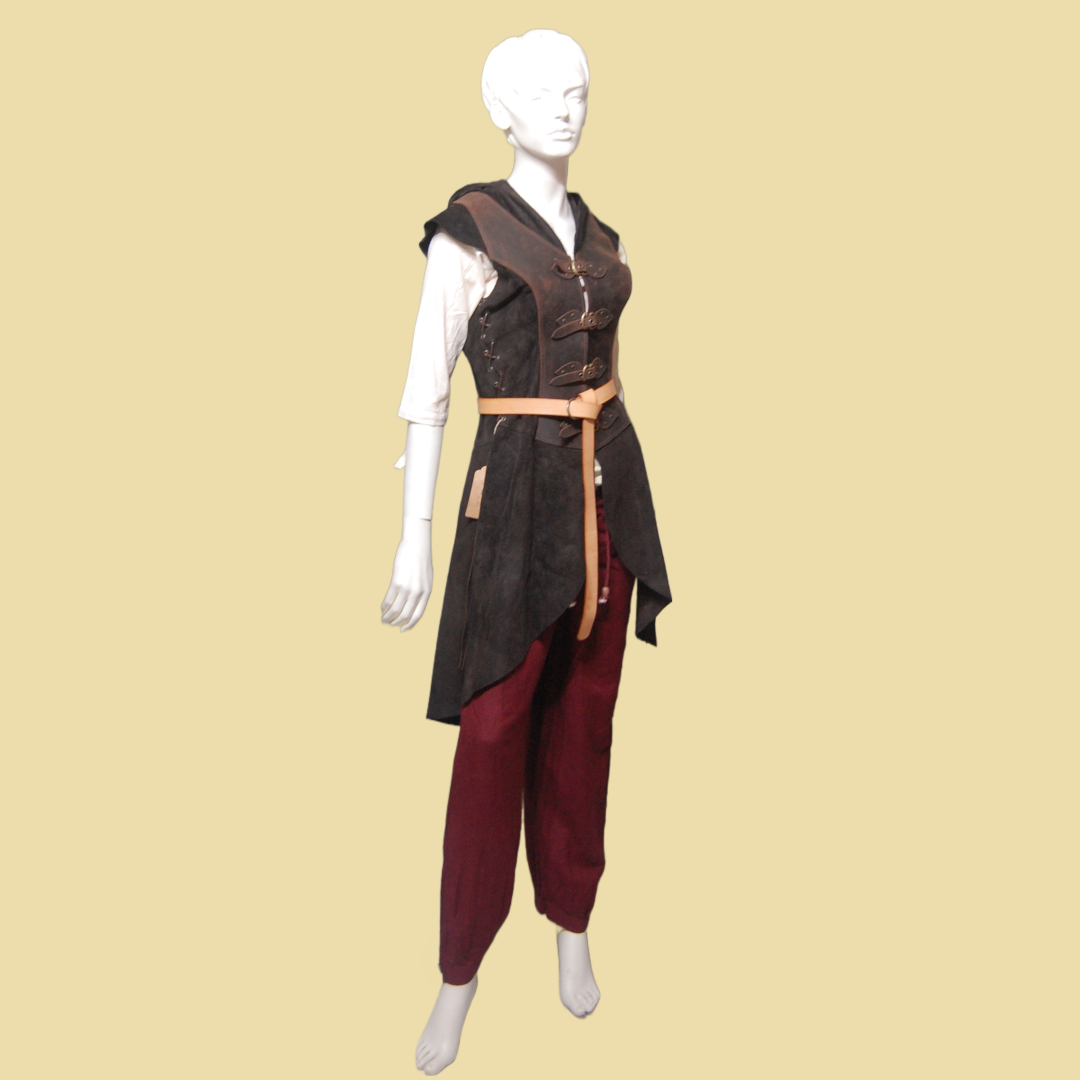 Damenwaffenrock mit Kapuze aus dunkelbraunem Fettleder mit Pull-Up-Effekt und ebenfalls dunkelbraunem Rindveloursleder, mit nach hinten länger werdenden Schößen. Er wird an den Seiten mit Lederbändern geschnürt und auf der Vorderseite mit dekorativen Schnallen geschlossen, so dass er in der Weite variabel ist. Durch den eng anliegenden Schnitt und die Kapuze, eignet sich der Waffenrock vor allem für die meisten Waldläufer Charaktere, sowie die eher zwielichtigen Rollen im Larp.