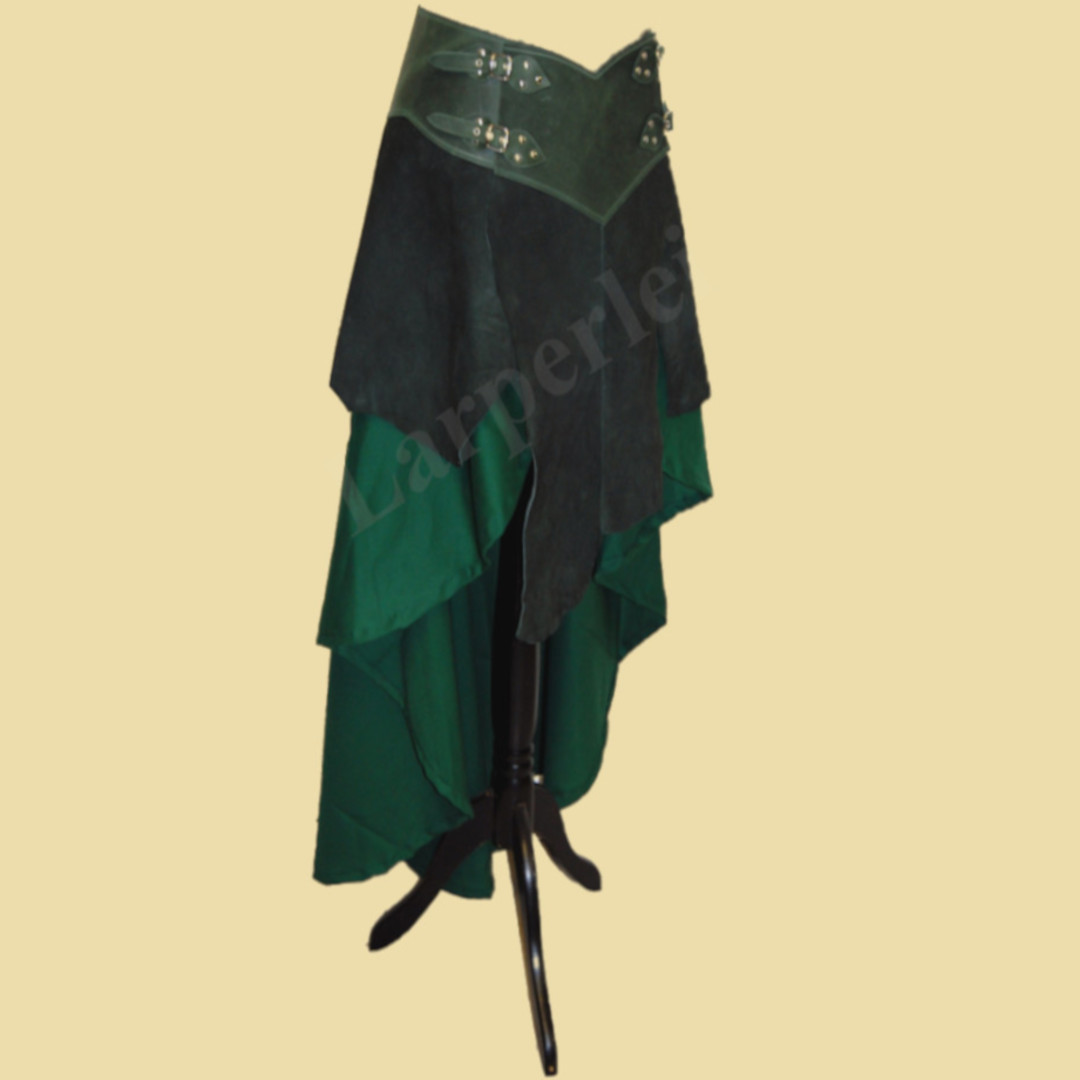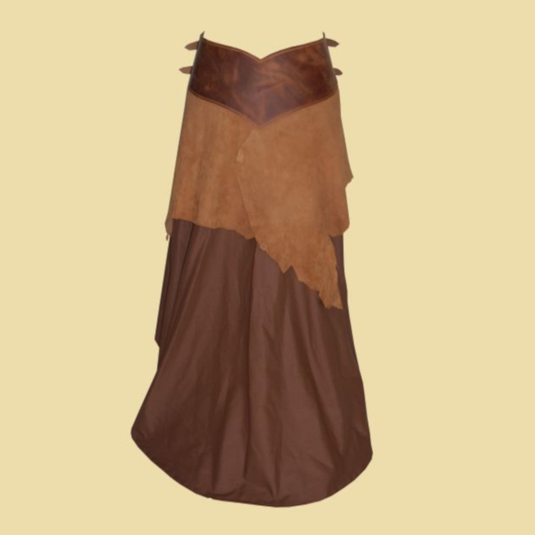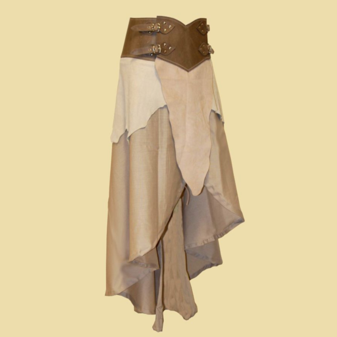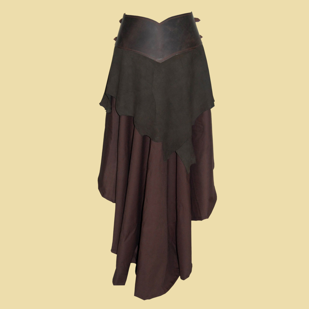 Rock aus Leder (Ziegen- und Fettleder) und Baumwolle. Mit 4 Schnallen am Bund aus Fettleder lässt sich der Rock auf den angenehmsten Tagekomfort einstellen und bleibt in der Weite variabel. Der Clou ist jedoch das sich der Stoffteil des Rock mit einer versteckten Schnürung abnehmen lässt und der Rock auch kurz getragen werden kann. Ein passendes Kleidungsstück nicht nur für Elfen auf dem Larp oder einem Mittelaltermarkt