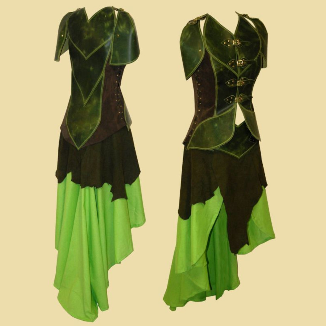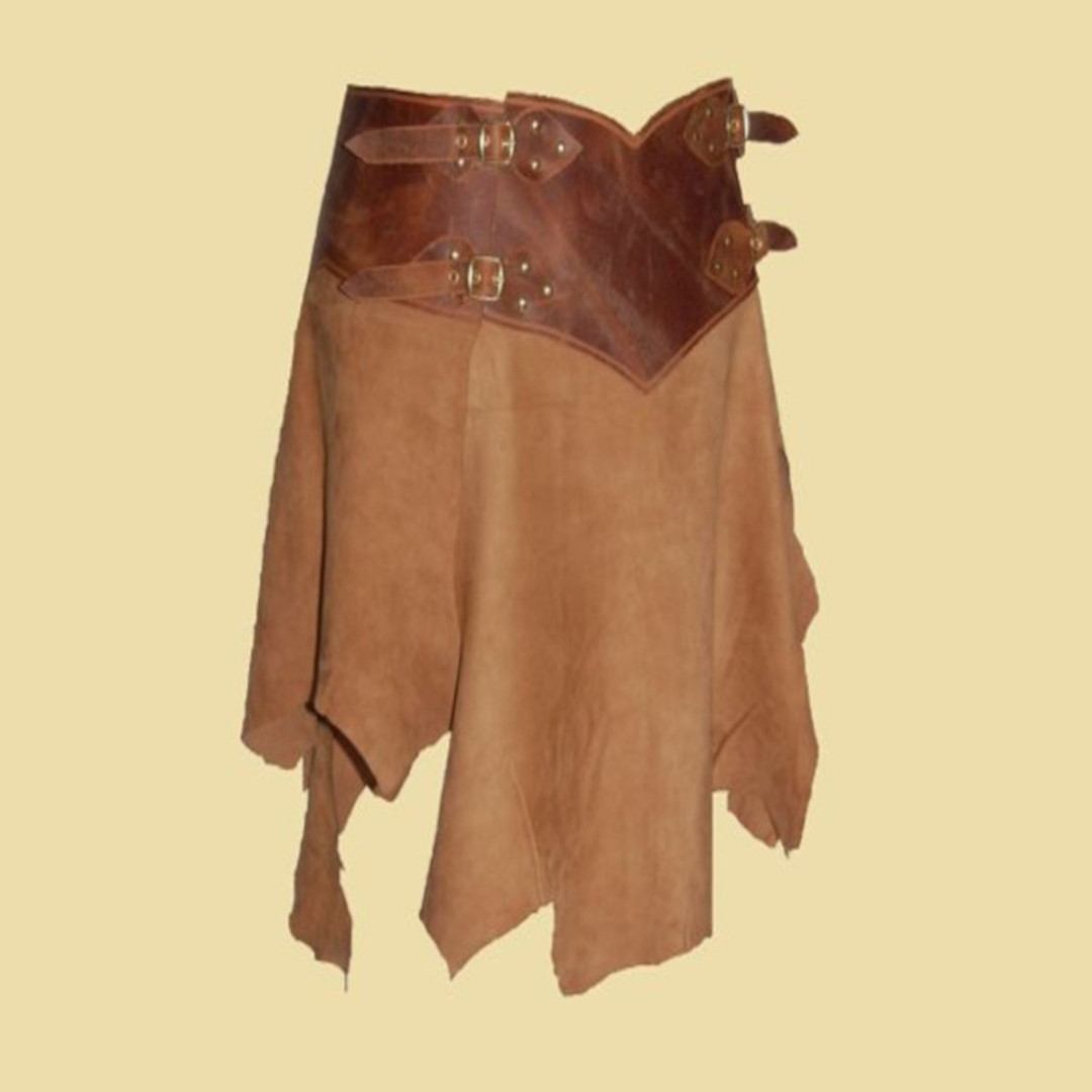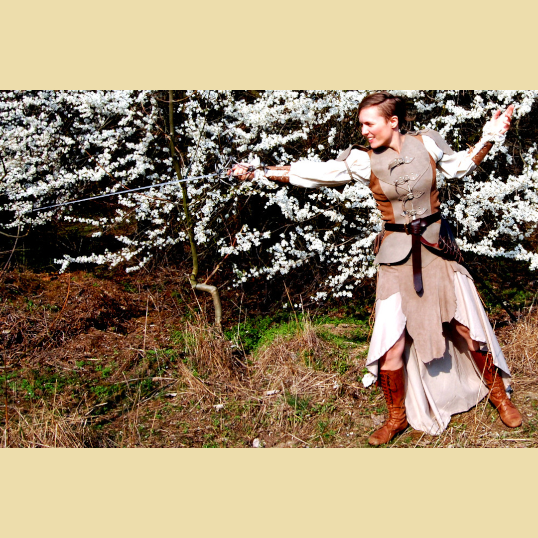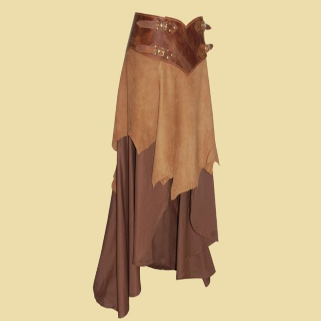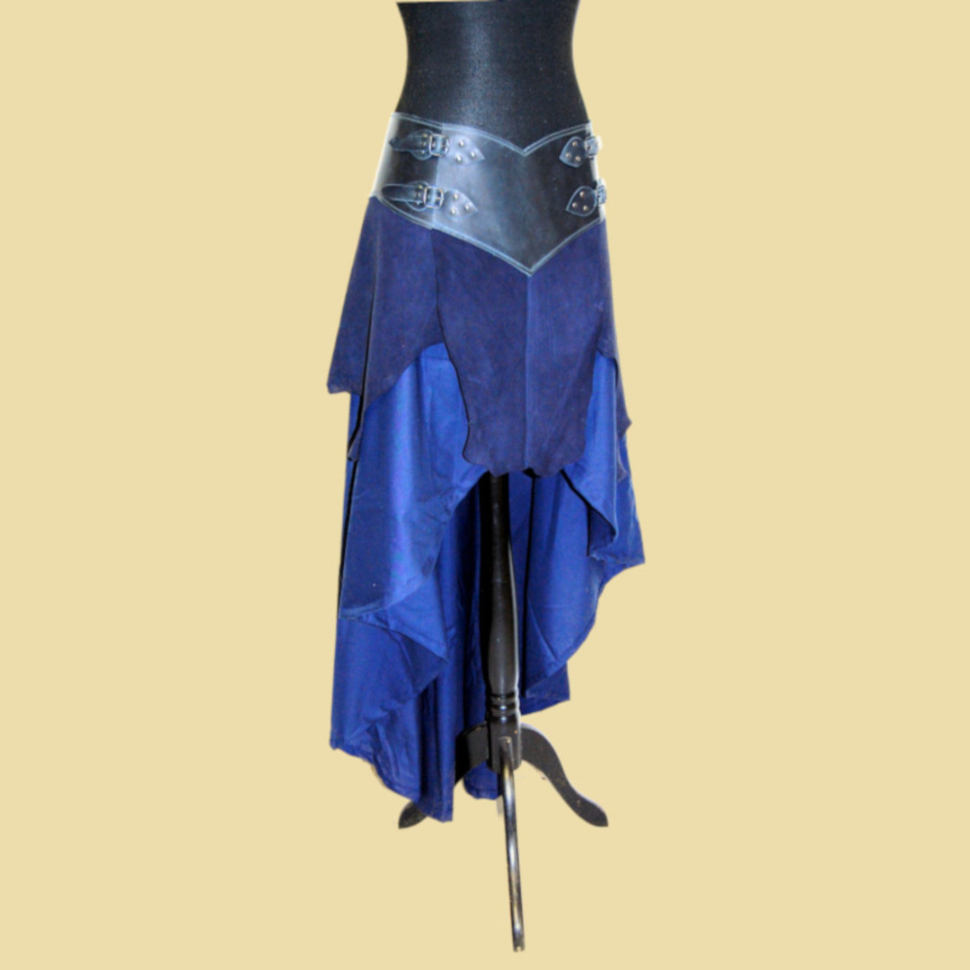 Rock aus Leder (Ziegen- und Fettleder) und Baumwolle. Mit 4 Schnallen am Bund aus Fettleder lässt sich der Rock auf den angenehmsten Tagekomfort einstellen und bleibt in der Weite variabel. Der Clou ist jedoch das sich der Stoffteil des Rock mit einer versteckten Schnürung abnehmen lässt und der Rock auch kurz getragen werden kann. Ein passendes Kleidungsstück nicht nur für Elfen auf dem Larp oder einem Mittelaltermarkt