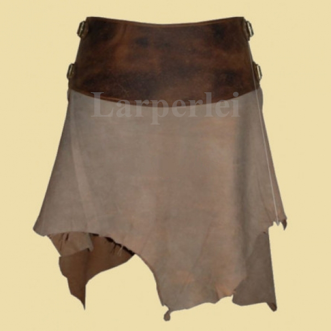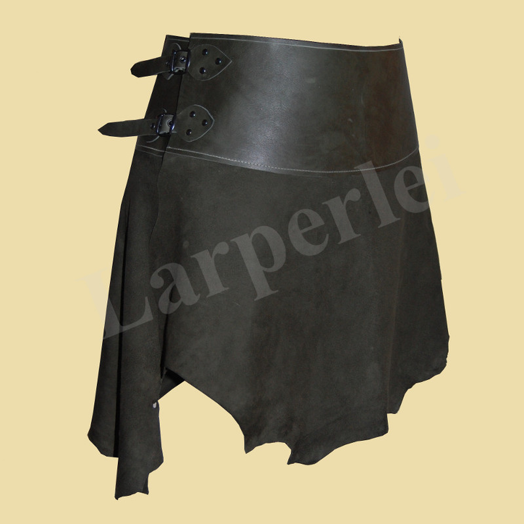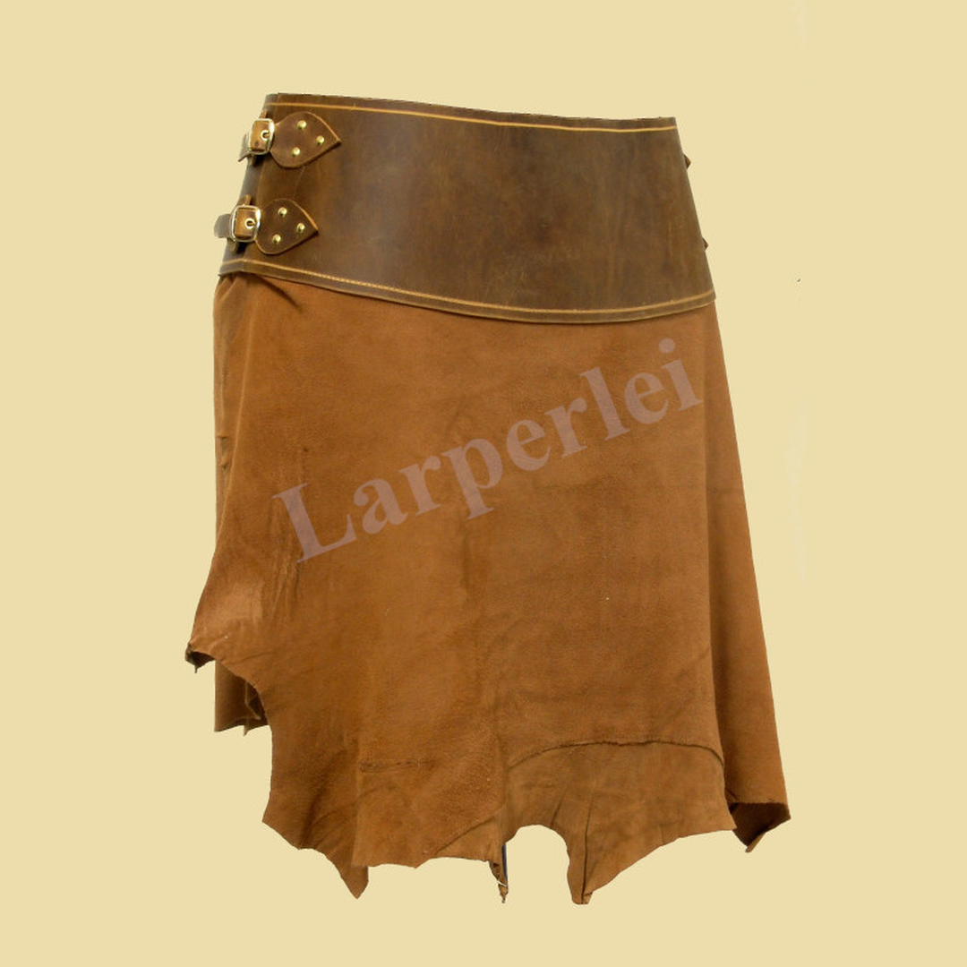 Ein auf beiden Seiten geschlitzter Überrock der natürlich auch als normaler Rock getragen werden kann. Er ist gefertigt aus Ziegenvelour mit einem Bund aus Fettleder. Geschlossen wird er seitlich mit je 2 Schnallen. Die Länge kann aufgrund der natürlichen Länge der Lederhaut leicht variieren.