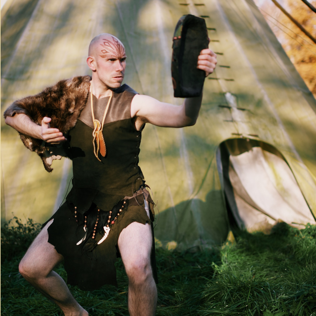 Ein aufwändig gearbeiteter Rock aus Fettleder, Fell und zum Teil zwei Lagen Ziegenvelour. Das Ziegenleder ist dabei bewußt in seiner Naturform belassen. Wir verwenden nach Möglichkeit für diese Röcke Leder mit kleinen Narben oder sonstigen Spuren eines bewegten Naturlebens. Verziert ist der Rock mit einer viereckigen Ziernieten, Ketten aus Holzperlen und sonstigem "Naturschmuck" wie Knochen, Zähne oder Muscheln und einem Beutel für z.B einen Talsiman. Er wird seitlich mit einer Metallschnalle geschlossen.
