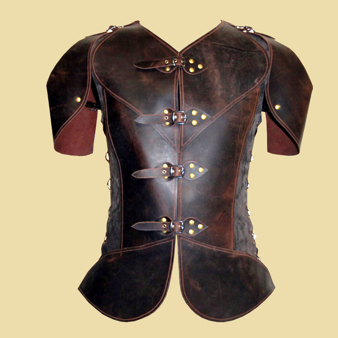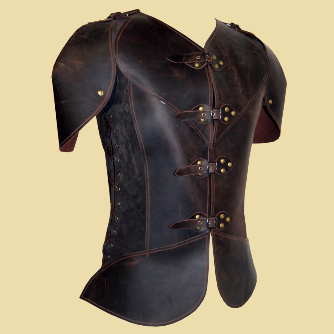 Rüstwams mit Seiten aus Velours-, Brust und Rücken aus Fettleder. Es besitzt abnehmbare Schultern und ist mit ins Leder eingeritzten Zierrillen geschmückt. Das Wams wird vorne mit Schnallen und auf den Seiten mittels einer Schnürung geschlossen und ist somit in der Weite an die Figur individuell anpassbar.