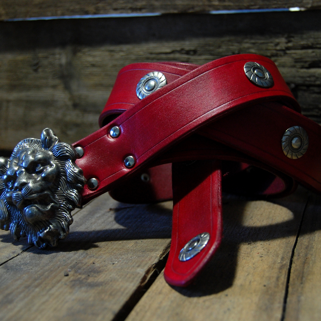 Handgefärbter Gürtel mit einer silberfarbenen Buckleschnalle in Form eines Löwenkopfes. Der Gürtel ist mit je einer eingeritzen Rillen an den Kanten und Ziernieten über die komplette Länge verziert. Der Gürtel hat keinen Bügel und wird mittelalterlich geknotet getragen.