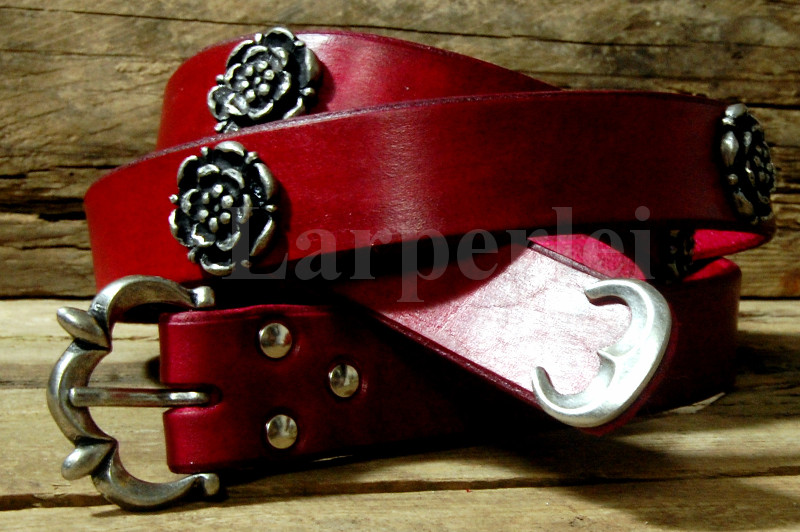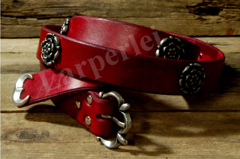 Handgefärbter Prunkgürtel mit Schnalle und Riemenende aus dem Hochmittelalter. Er ist mit mehreren Rosenfömigen Ziernieten im Abstand von ca. 10 cm verziert Der Gürtel ist 3 cm breit und wird geknotet getragen, hat also keinen Bügel. Rechnet daher ein paar cm mehr ein. Schließe und Riemenende orientieren sich an historischen Funden und passen daher hervorragend zur Darstellung eines Ritters oder Adligen im Larp oder für den Besuch eines Mittelaltermarkts.