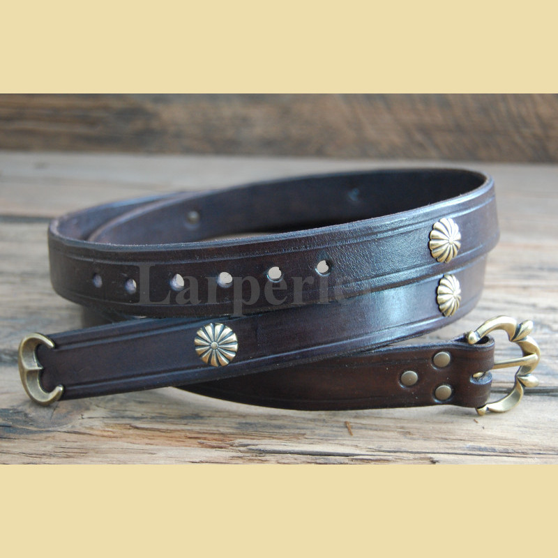 Handgefärbter Langgürtel mit Zierrillen und mittelalterlichem Riemenende. Er ist über die komplette Länge mit rosettenförmigen Ziernieten besetzt. Der Gürtel ist 3 cm breit und wird geknotet getragen, hat also keinen Bügel. Rechnet daher ein paar cm (mindestens 20) mehr ein. Schließe Ziernieten und Riemenende orientieren sich an historischen Funden und passen daher hervorragend zur Darstellung eines mittelalterlichen Charakters wie z.B. einem Ritter oder Kaufmann im Larp oder für den Besuch eines Mittelaltermarkts.