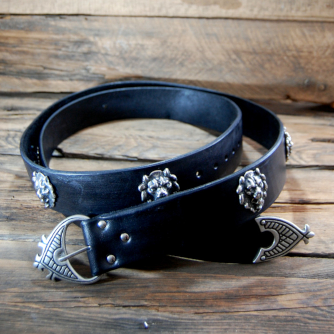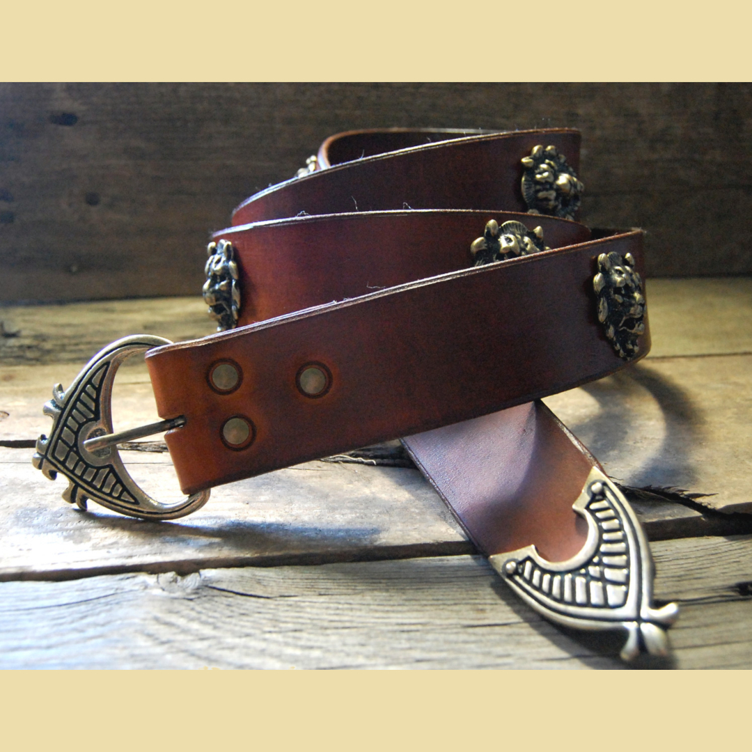 Ein Langgürtel mit massiver Schnalle und Riemenende. In regelmäßigem Abstand von ca. 10 cm. sind mehrere Ziernieten in Form eines Löwenkopfes über den Gürtel verteilt. Nach der Lochung sind sie um 90 Grad gedreht damit sowohl die Köpfe um den Rumpf als auch die am hängenden Ende des Gürtels im getragenen Zustand gleich ausgerichtet sind. Der Gürtel ist 4,5 cm breit und wird geknotet getragen, hat also keinen Bügel. Rechnet daher ein paar cm mehr ein. Schließe und Riemenende orientieren sich an historischen Funden und passen daher hervorragend zur Darstellung eines Ritters im Larp oder für den Besuch eines Mittelaltermarkts.