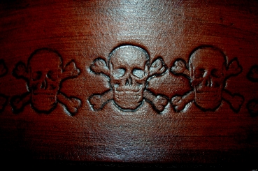 Der Gürtel ist 6cm breit und wird modern getragen, hat also die Löcher an der Gürtelspitze und wird nicht mittelalterlich geknotet. Die Löcher enden ca. 10 cm vor der Spitze. Die Schließe orientiert sich an historischen Funden und passt daher hervorragend zur Darstellung eines Piraten, Musketier oder Landsknechts im Larp oder für den Besuch eines Mittelaltermarkts. Der Gürtel selbst wurde mit dem Motiv des Jolly Roger, des Totenschädels mit gekreuzten Knochen, über die komplette Länge geprägt und danach mit einem antik Finish versehen der die Prägung optisch herausarbeitet.