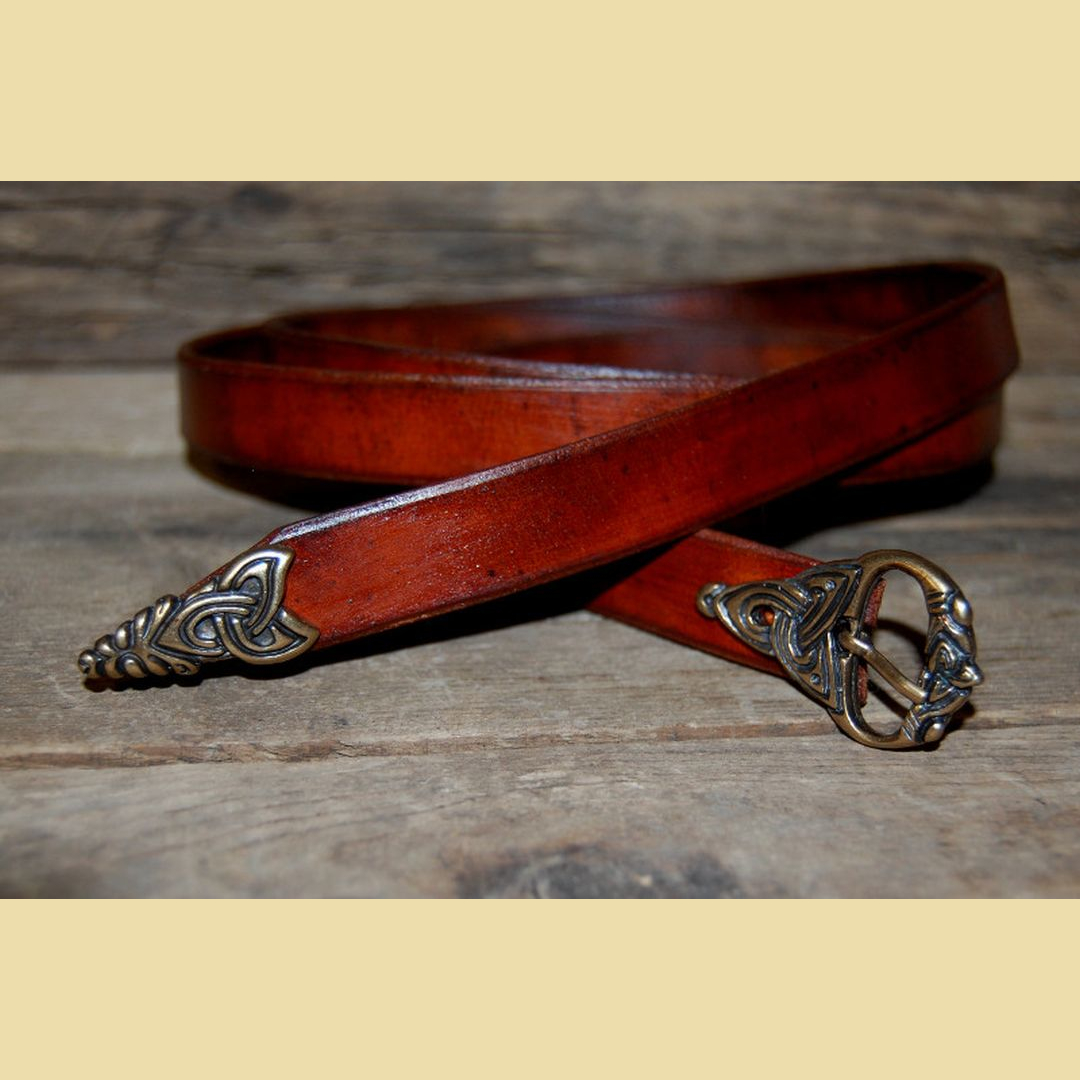 Langgürtel mit einer Schnalle und einem Riemenende der Wikingerzeit. Der Gürtel ist 2 cm breit und wird geknotet getragen, hat also keinen Bügel. Rechnet daher bei der Länge ein paar cm mehr ein. Schließe und Riemenende orientieren sich am Borrestil und passen daher hervorragend zur Darstellung eines Nordmanns im Larp oder für den Besuch eines Mittelaltermarkts.