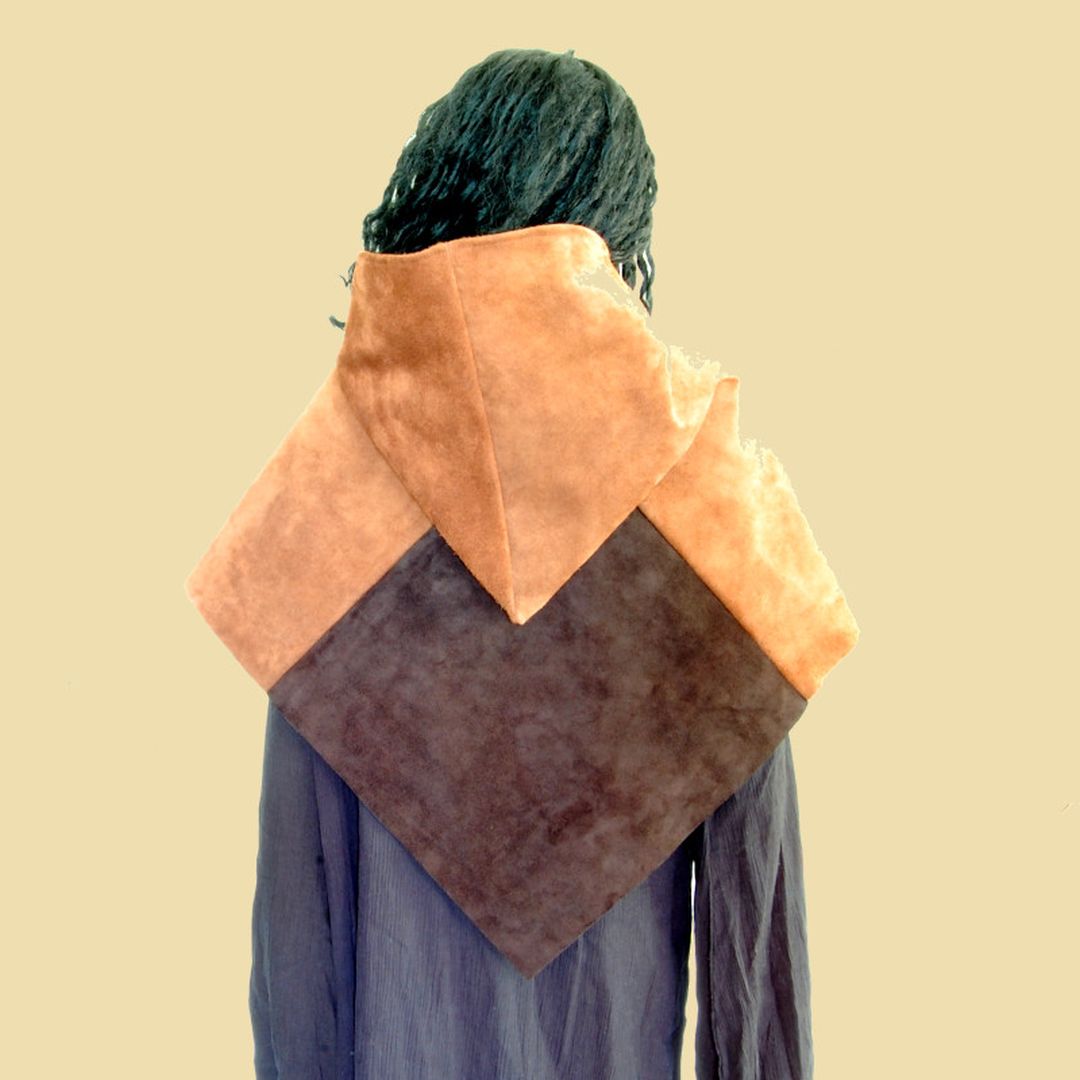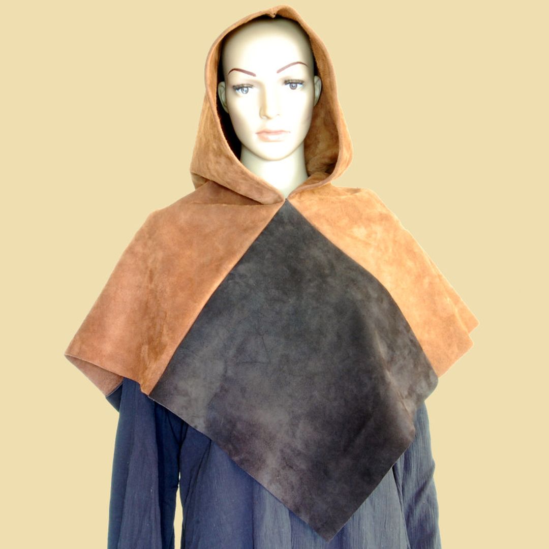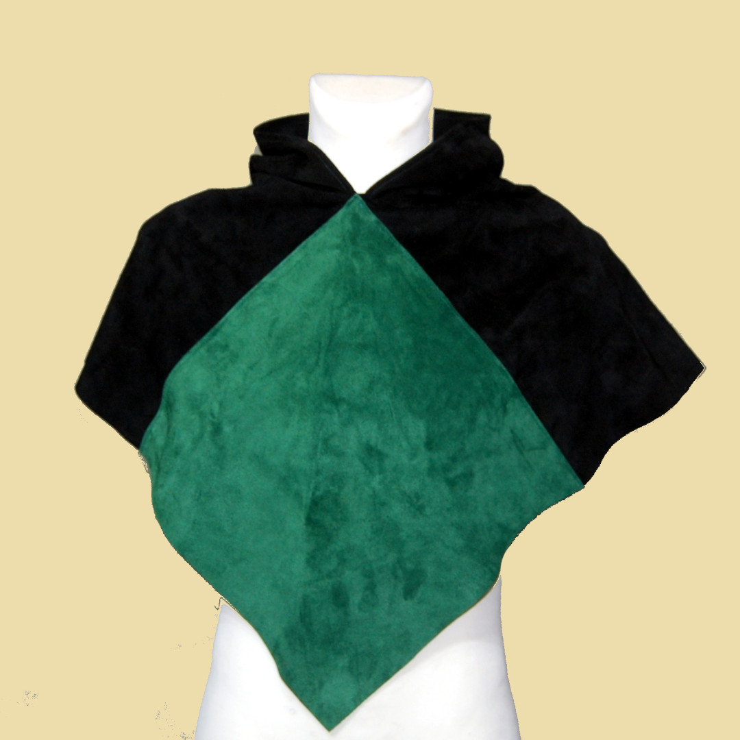 Eine Ledergugel aus Velourleder. Sie fällt tief in Brust und Rücken. Vorne ist ein Keil aus andersfarbigem (sofern ihr euch dafür entscheidet) Velursleder eingesetzt. Die Gugel schützt Schultern und Nacken vor Wind und Feuchtigkeit was sie zu einem nicht nur kleidsamen sondern auch praktischen Kleidungsstück im Larp oder einem Mittelaltermarkt macht.