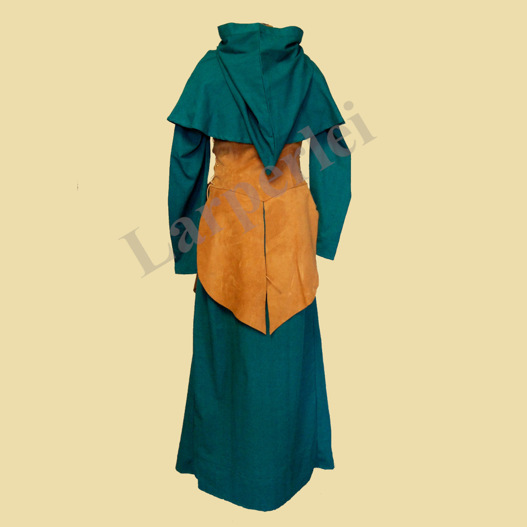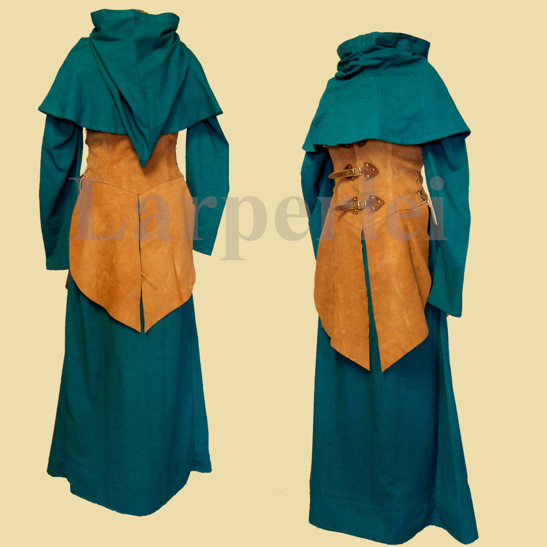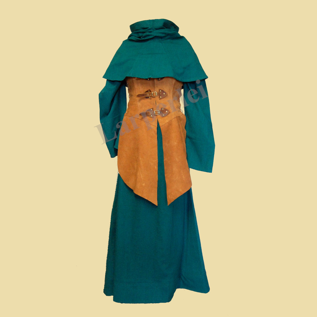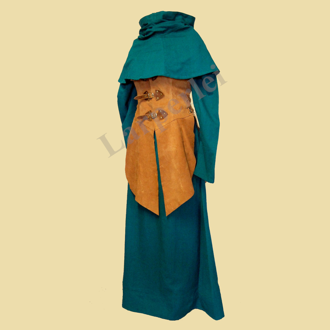 Ein Gewandungsset für die Dame, bestehend aus einer Robe und Gugel aus Baumwolle und einem Waffenrock aus Velourleder. Der Waffenrock wird mit einem Schnallenverschluss auf der Vorderseite verschlossen und an den Seiten mit Lederbändern geschnürt, so dass er in der Weite variabel ist und einen hohen Tragekomfort bietet. Je nach Körpergröße reicht der Waffenrock etwa bis zum Knie.