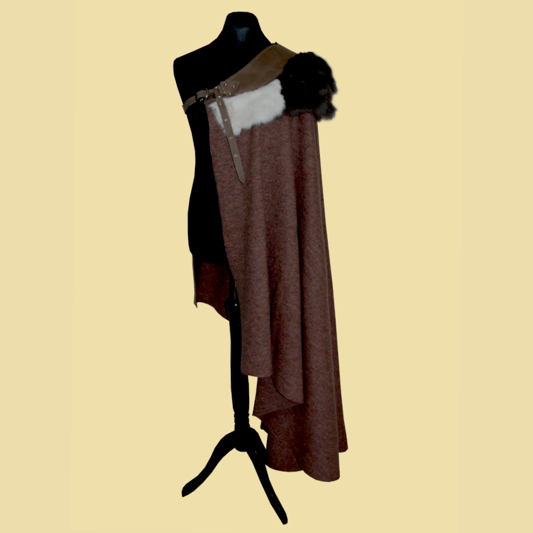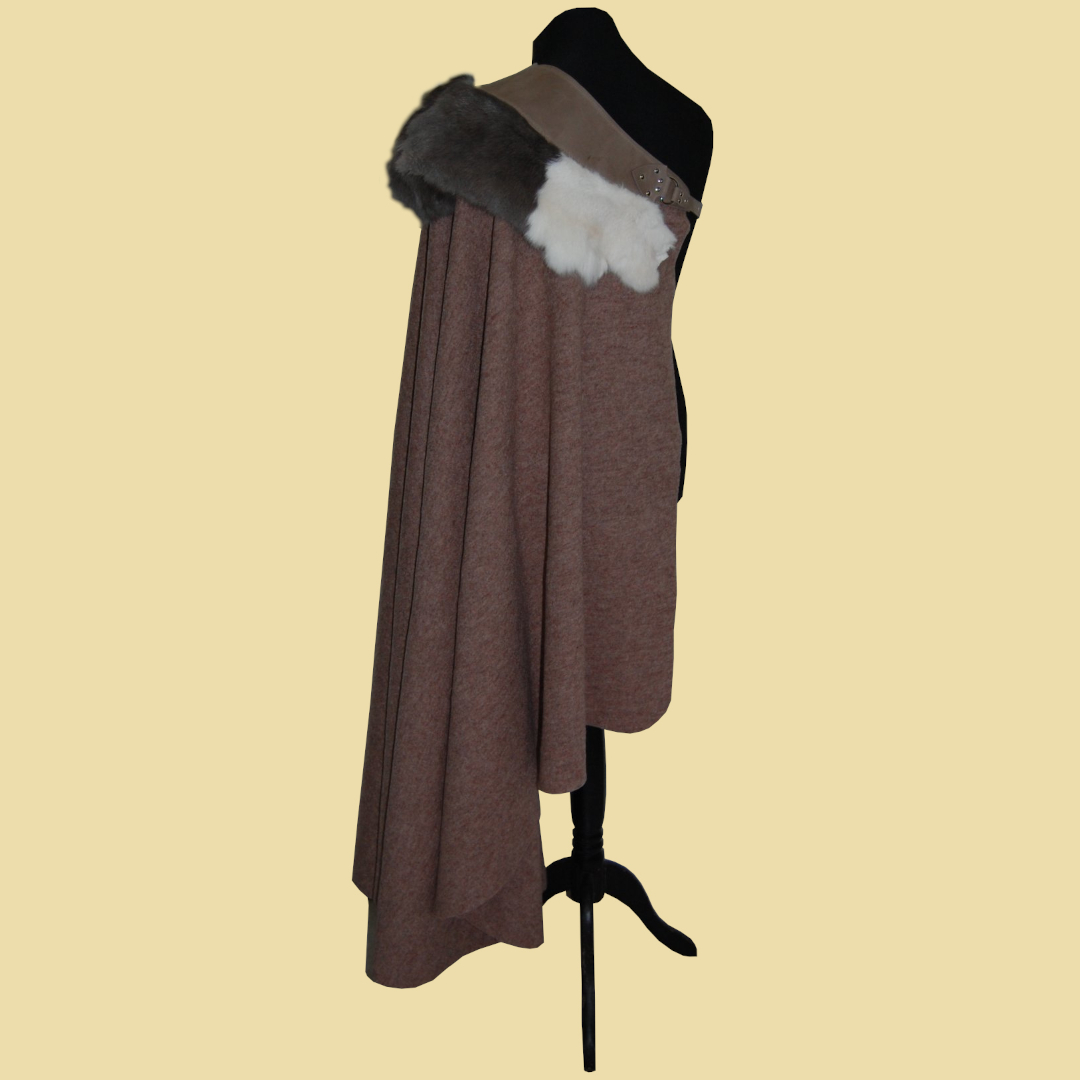 Ein Halbmantel aus dunkelbeigefarbenem Walkloden, Kaninchenfell und schlammgrauen Fettleder für die kältere Jahreszeit. Er wird mit einer Schnalle geschlossen und kann entweder wie ein Musketiermantel schräg über die Schulter fallend getragen werden oder aber als hoch stehender Kragenumhang mit der Öffnung auf der Vorderseite.