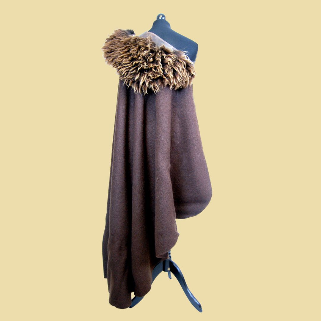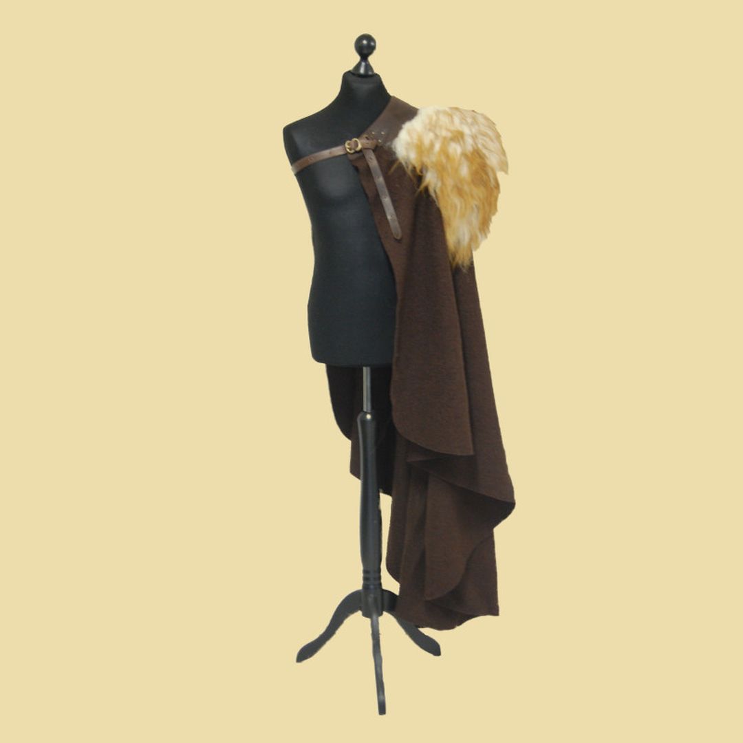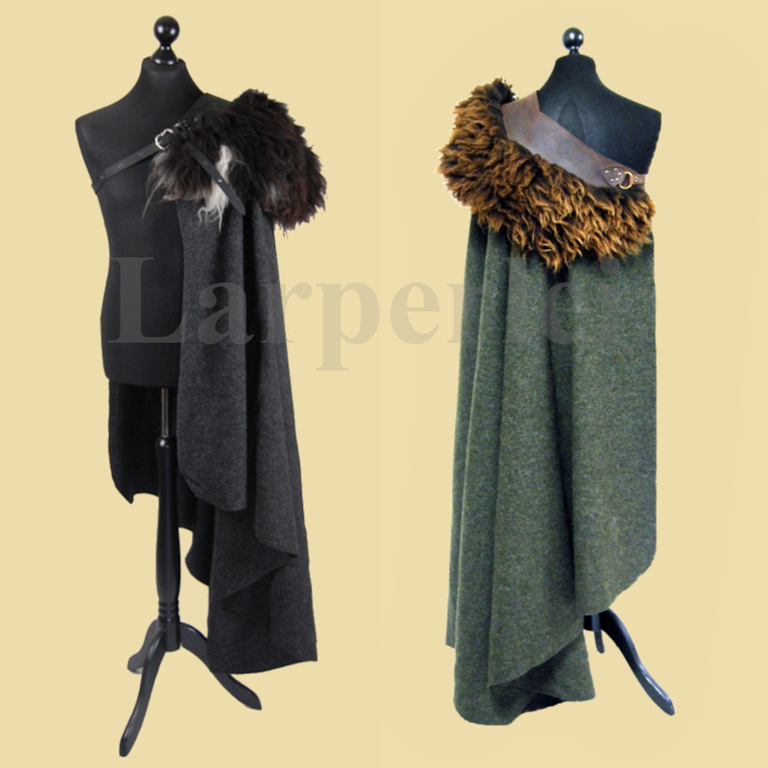 Ein Halbmantel aus Walkloden, Schaffell und Fettleder für die kältere Jahreszeit. Er wird mit einer Schnalle geschlossen und kann entweder wie ein Musketiermantel schräg über die Schulter fallend getragen werden oder aber als hoch stehender Kragenumhang mit der Öffnung auf der Vorderseite.