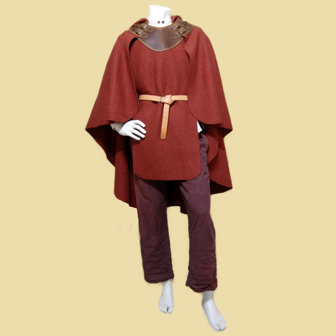 ,Abgerundeter Halbkreis-Umhang aus Fettleder und Walkloden. Er besitzt einen separaten vorderen Schurz, der wärmend an den Körper gegürtet werden kann. Der Rest des Umhangs fällt frei über Schultern, Arme und Rücken und schränkt somit nicht die Bewegung ein. Der Umhang wird mit 4 dekorativen Schnallen geschlossen. Unser Reiseumhang ist gerade an kalten und/oder regnerischen Tagen eine sinnvolle Ergänzung für jeden Larp Charakter bzw, Besucher eines Mittelaltermarktes