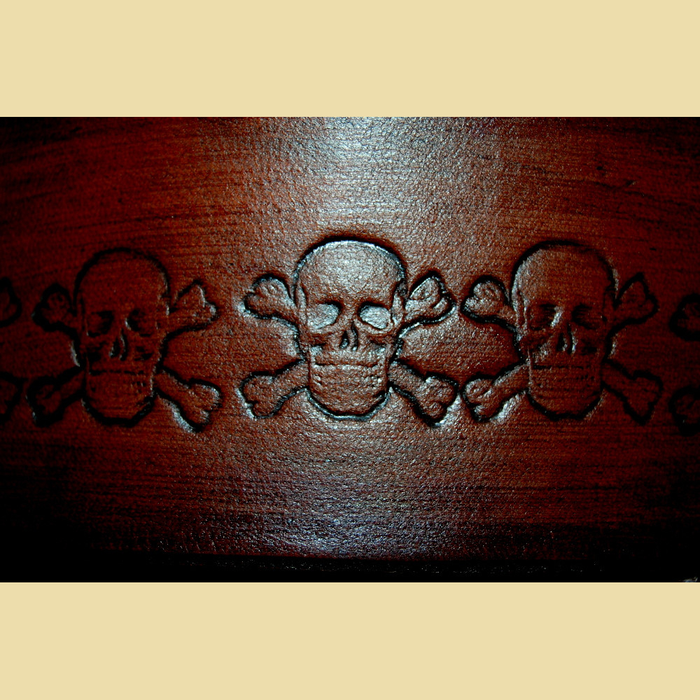 The belt is 6cm wide and is worn modern, has the holes at the top of the belt and is not knotted medieval. The holes end about 10 cm before the top. The buckle is based on historical finds and therefore fits perfectly to the representation of a pirate, musketeer or lansquenet in the Larp or for the visit of a medieval market. The belt itself was embossed with the motif of the Jolly Roger, a skull with crossbones, over the entire length and then provided with an antique finish that optically emphasizes the embossing.