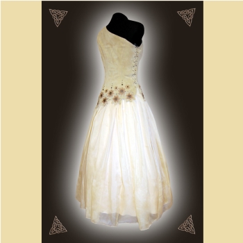 Asymmetrisch geschnittenes, gefüttertes Lederkleid aus naturfarbenem Rindveloursleder, beigefarbenem Rindernubuk, sandfarbenem Jersey und naturfarbenem Voilé. Das Kleid ist verziert mit aufgesetzten Lederblüten, feinen Metallornamenten und aufgestickten Metallperlen. Es wird seitlich mit einer Schnürung geschlossen, so dass es in der Weite variabel ist. (Lieferung ohne Reifrock)