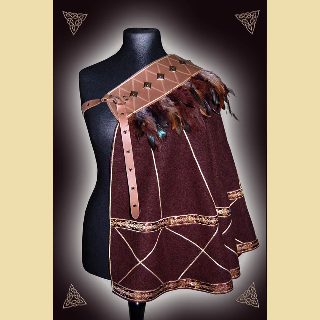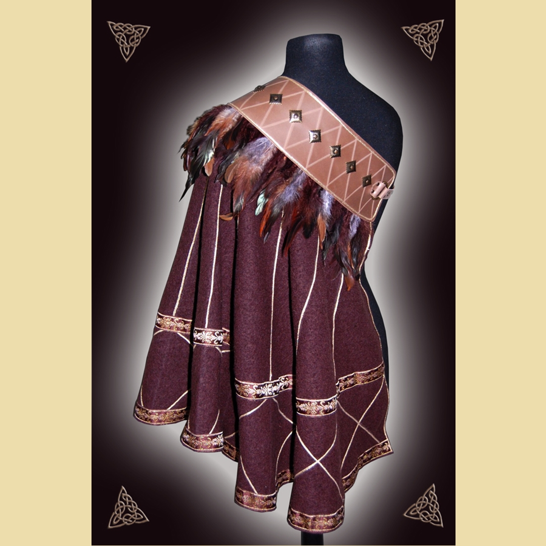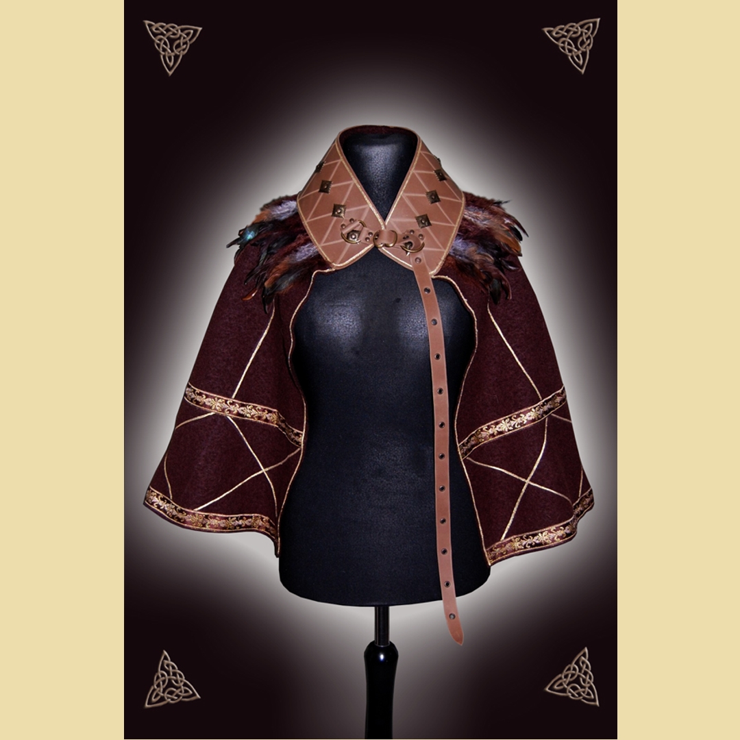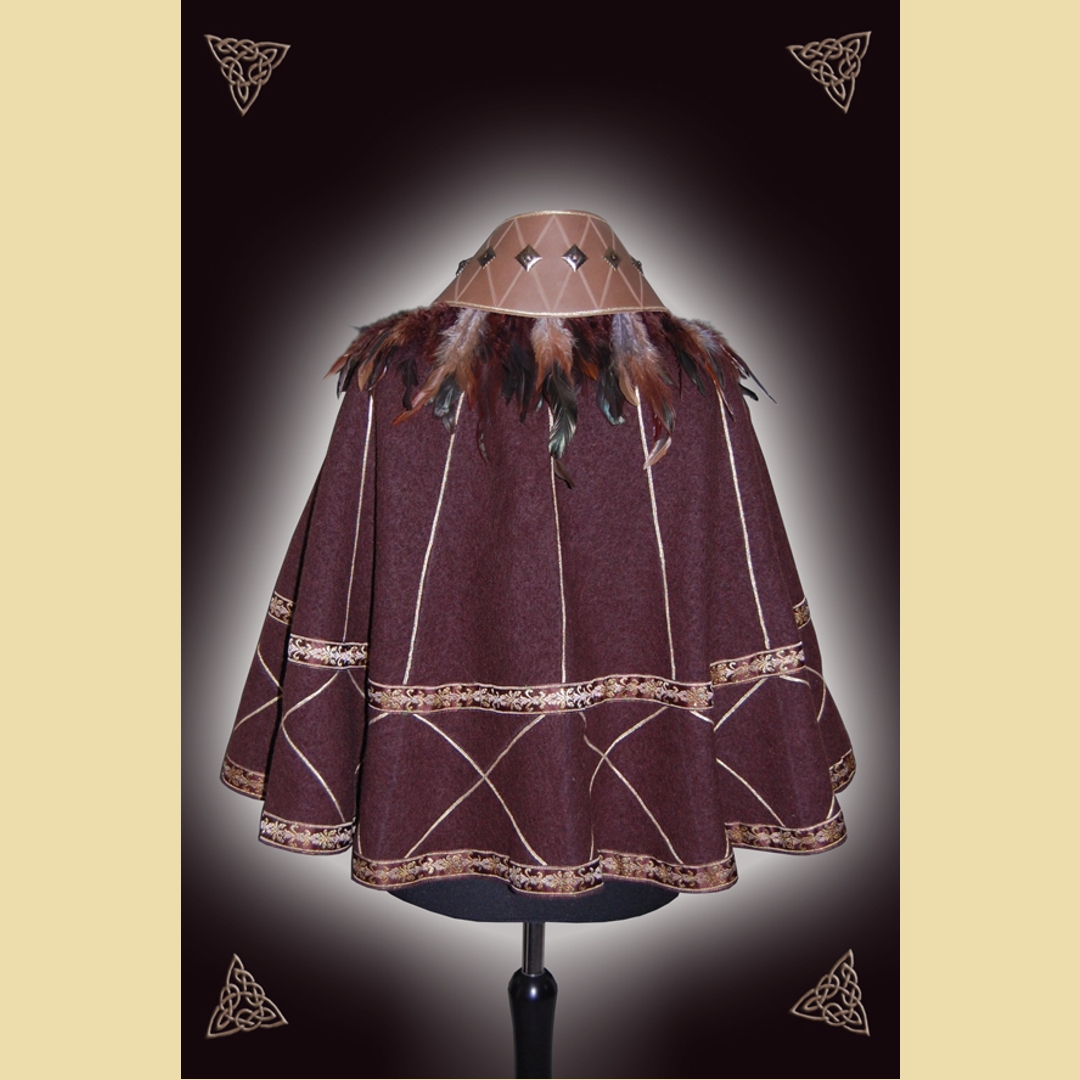 Kurzer Halbmantel aus dunkelbraunem Walkloden und kaffeebraunem Fettleder mit dekorativem Federbesatz. Er ist verziert mit einem geritzten Rautenmuster und altmessingfarbenen Metallbeschlägen sowie einem aufwändigen Litzen- und Bortenbesatz auf dem Lodenteil. Der Mantel wird mit einer Schnalle geschlossen und kann entweder schräg über die Schulter fallend getragen werden oder aber als hoch stehender Kragenumhang mit der Öffnung auf der Vorderseite.