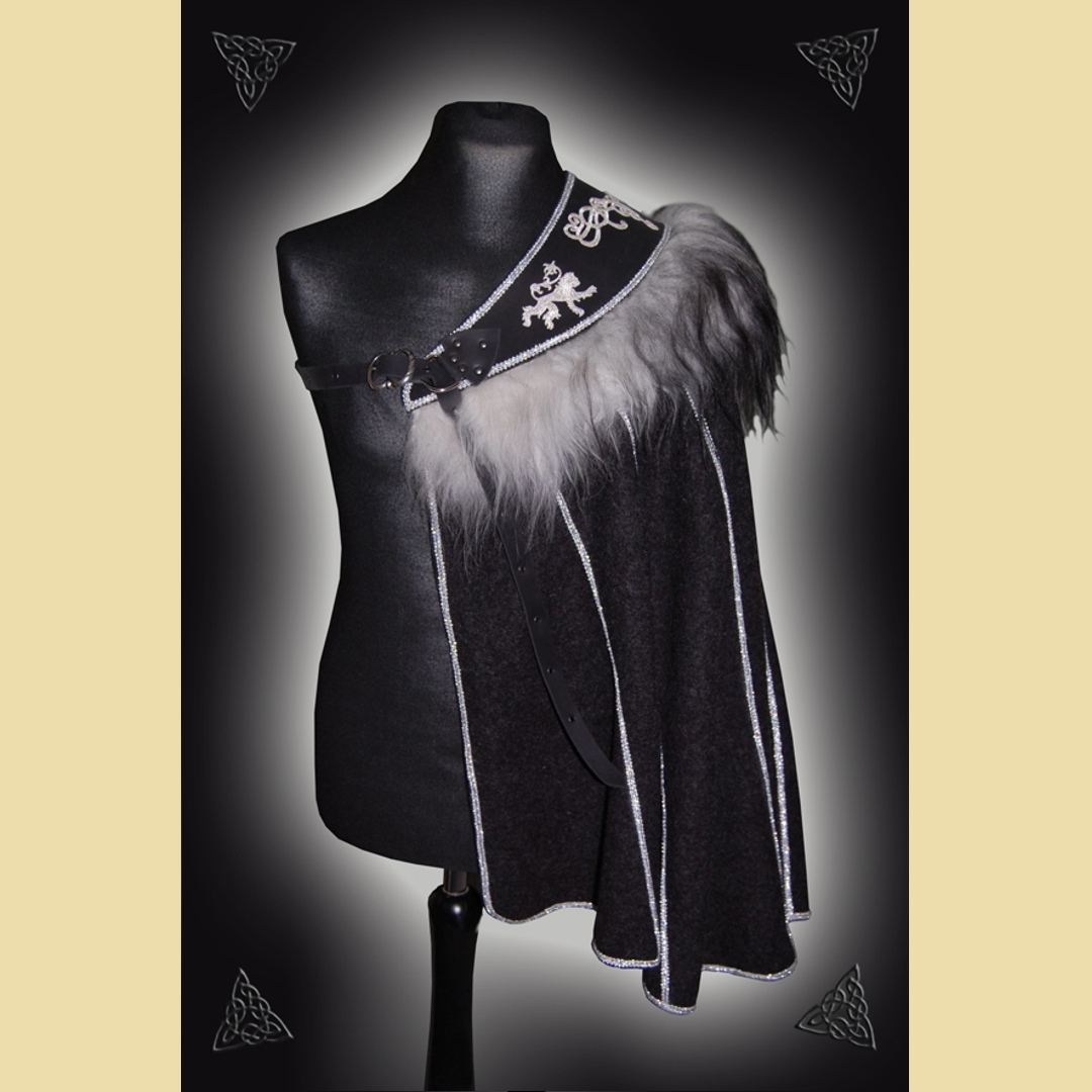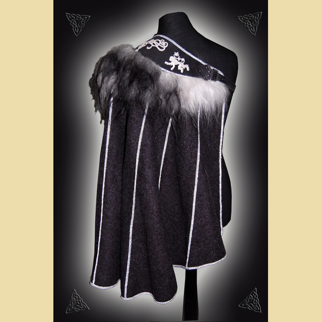 Anthrazitfarbener Halbmantel mit silbernen Löwen und Schaffellbesatz