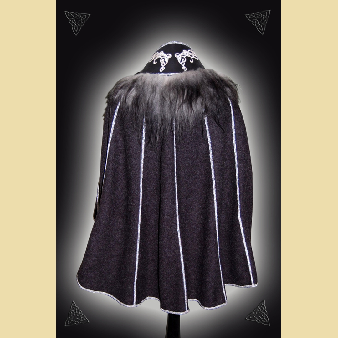 Kurzer Halbmantel aus anthrazitfarbenem Walkloden und schwarzem Fettleder mit dekorativem, schwarz-grau meliertem Schaffellbesatz. Er ist verziert mit gestickten silbernen Löwen und Ornamenten sowie silbernem Posamentenbortenbesatz auf dem Lodenteil. Der Mantel wird mit einer Schnalle geschlossen und kann entweder schräg über die Schulter fallend getragen werden oder aber als hoch stehender Kragenumhang mit der Öffnung auf der Vorderseite.