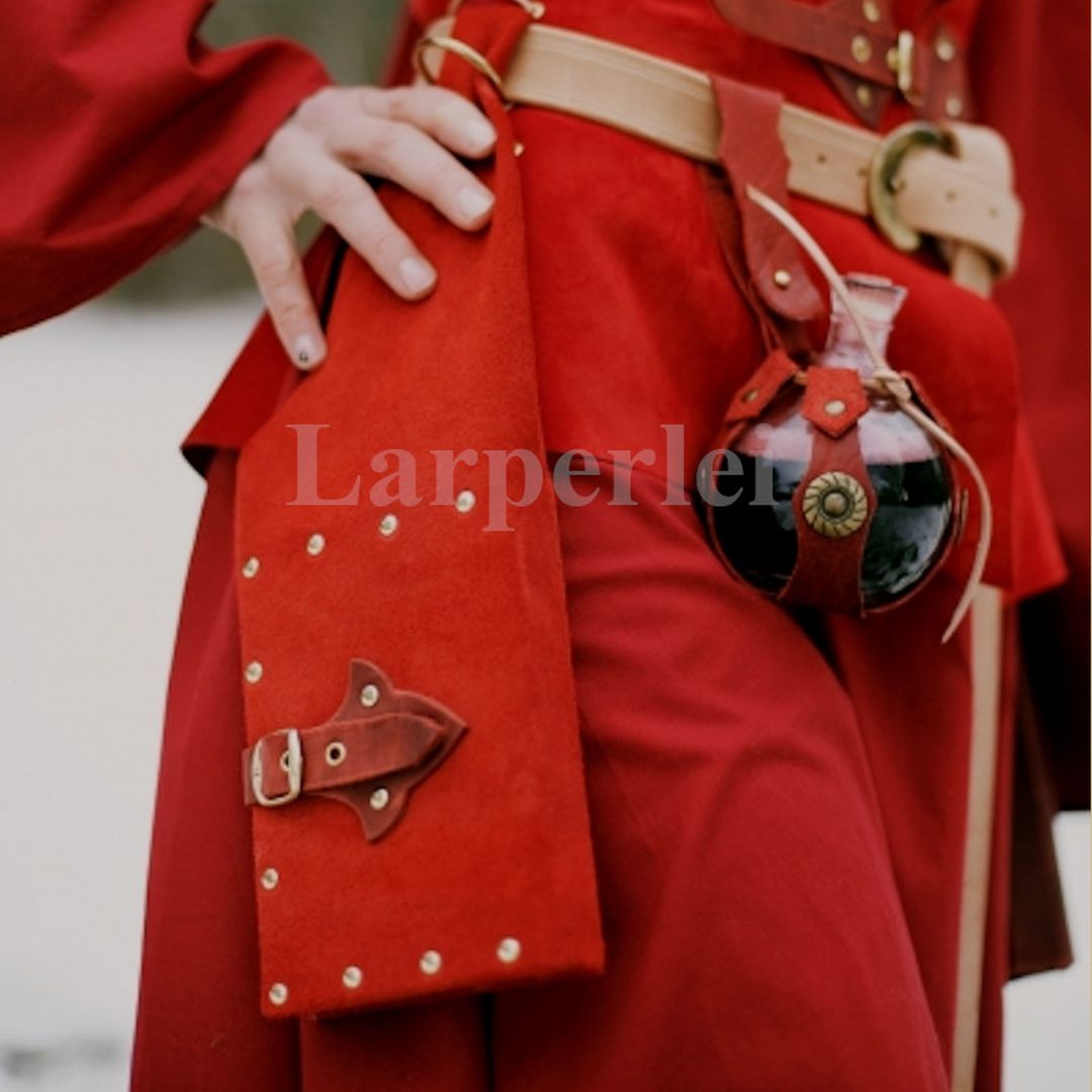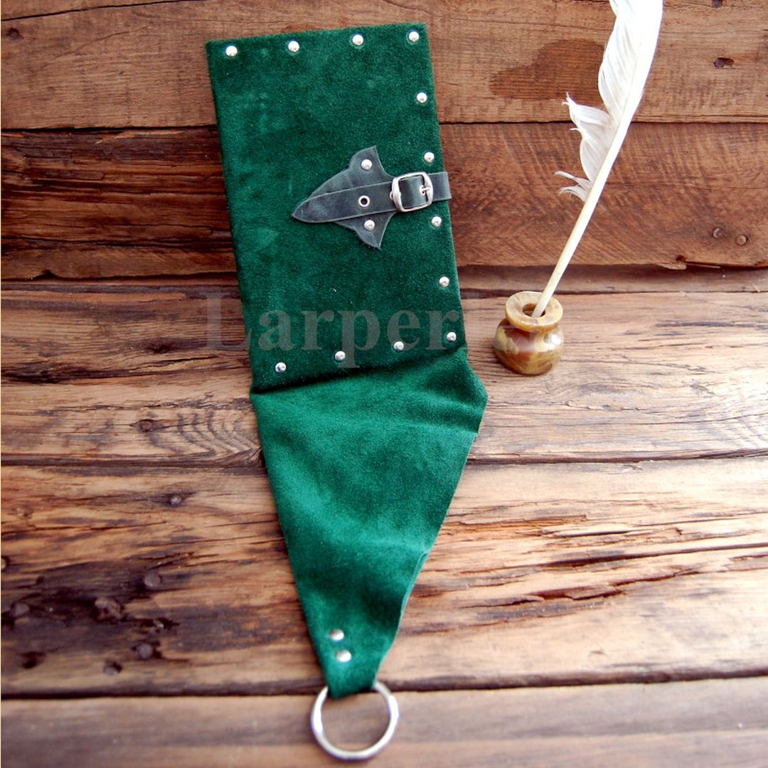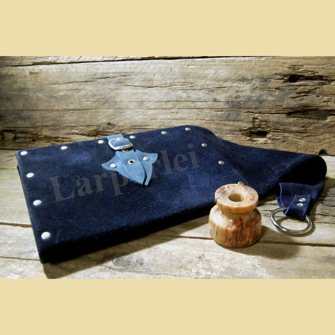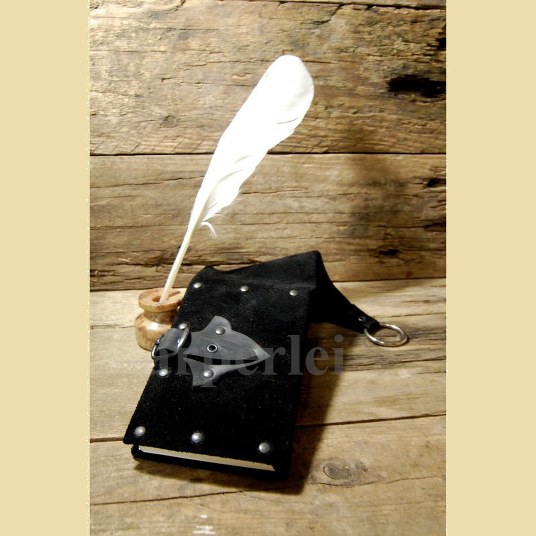 Ein in Rindvelour gebundenes Beutelbuch. Geschlossen wird es mit einer praktischen Schnalle. Das Buch hat rund 100 weiße und unbeschriebene Seiten. Das Beutelbuch kann mittels eines starken Metallrings am Gürtel befestigt werden. Ein nicht nur nützliches, sondern auch kleidsames Accessoire für Magier, Priester oder Gelehrte im Larp