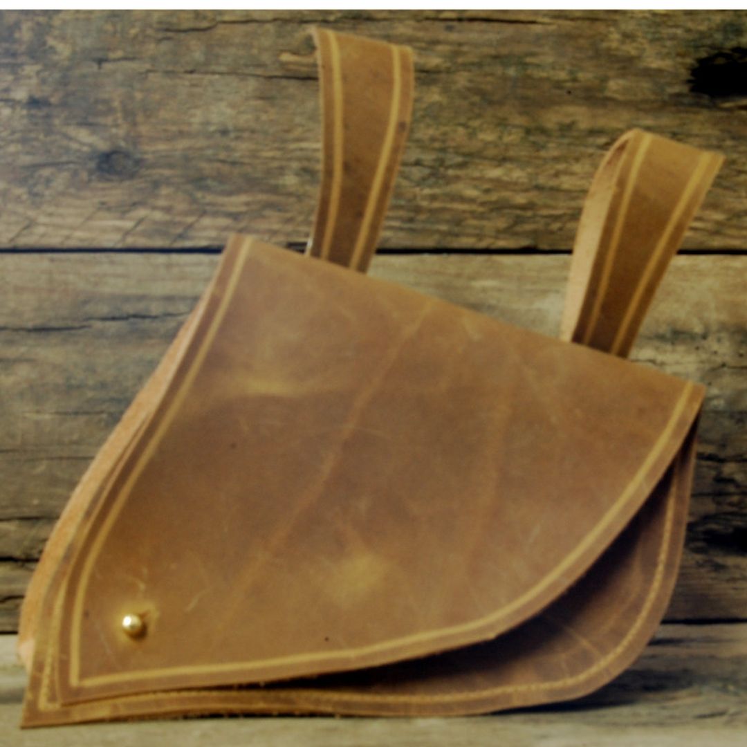 Gürteltasche aus Fettleder mit dekorativer Lasche. Sie ist mit einer umlaufenden Zierrille verziert und mit einem praktischen Patronenverschluß zu schließen. Ihre geschwungene Form macht sie zu einem idealen Accessoire für elfische oder orientalische Charaktere im Larp